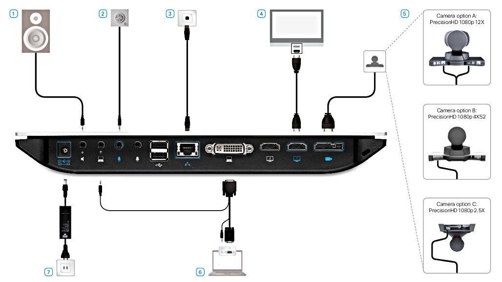 K videokonferenčnímu systému je třeba připojit jednu nebo dvě obrazovky, aktivní ozvučení, napájení a Internet.